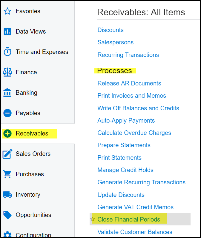 1. Receivables>Processes>Close Financial Periods