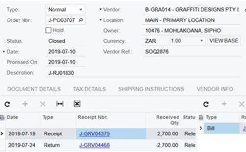So dan na boonste journal gepos is het die regte journal dan deurgegaan toe die PO Return gedoen is: