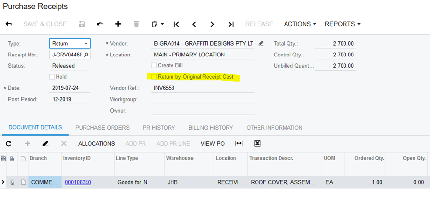 3) In the AP Bill created, unit cost should be corrected to the real purchase cost returned.