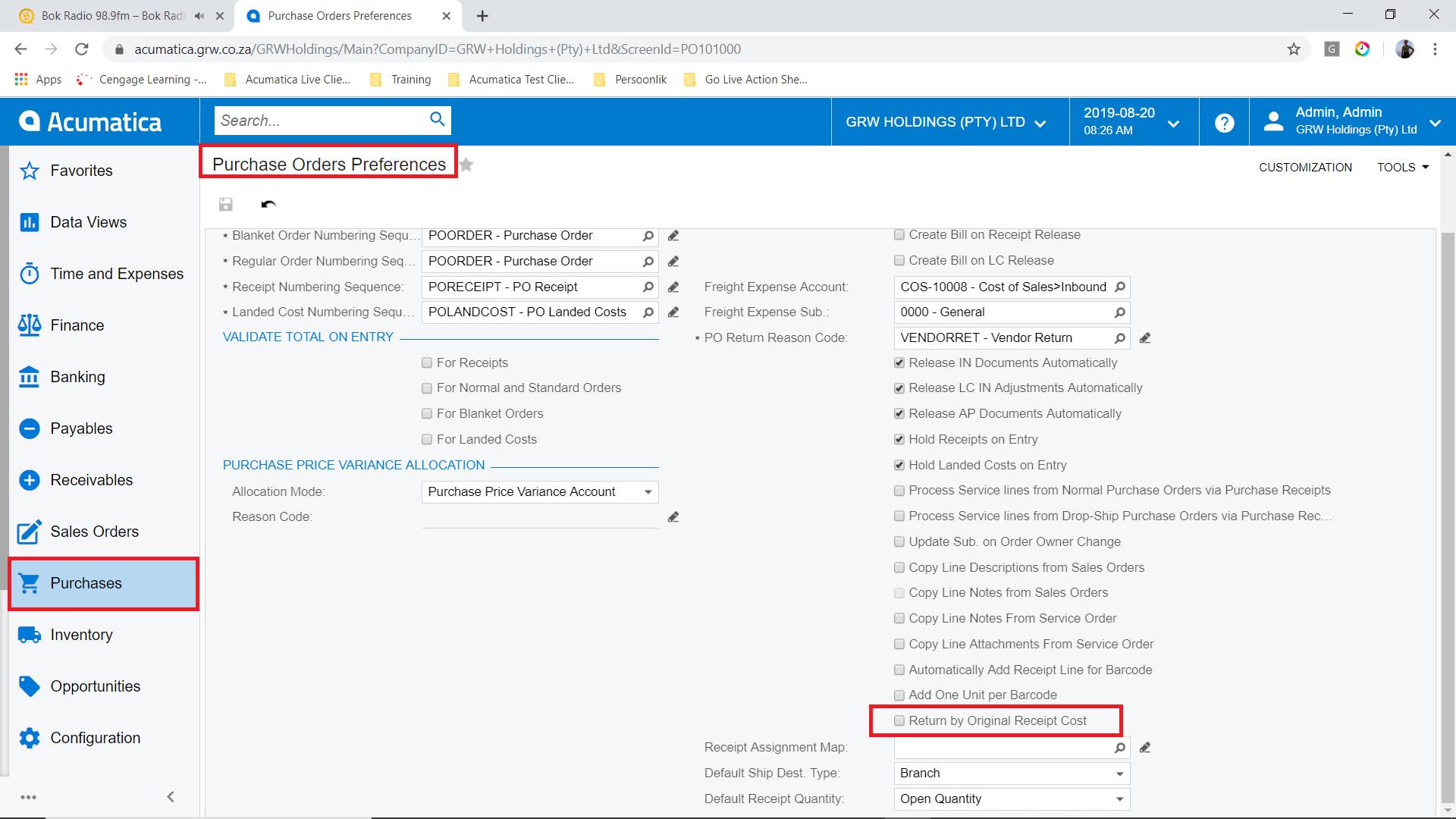 “In Build Version 18.205.0026 the Return by Original Receipt Cost check box has been added to the Purchase Orders Preferences (PO101000) form. The value of this check box is used as the default value of the Return by Original Receipt Cost check box on the Purchase Receipts form when a user creates a new purchase return.