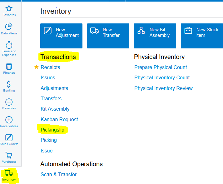 1. Click on Inventory>>>Transactions>>>Pickingslip: