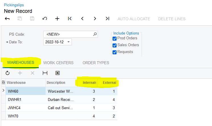 3. If needed change the default Internal or External sequence on the Warehouses Filter: