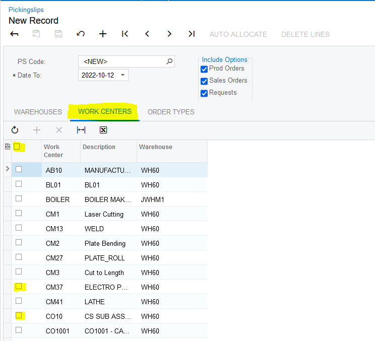 4. Select the relevant Work Centers for which you need to pick, or "Select All" in front of the Work Center column if your are picking for all the Work Centers: