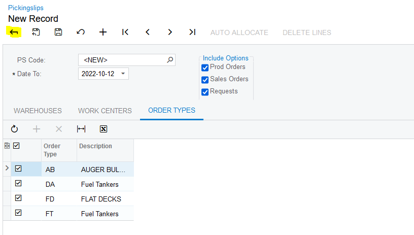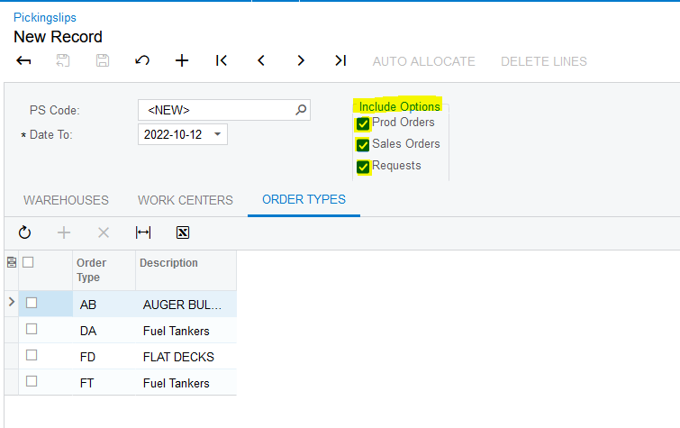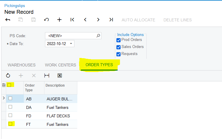 5. Select the relevant Order Types for which you need to pick, or "Select All" in front of the Order Type column if your are picking for all the Order Types: