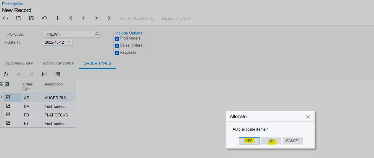 8. A Dialog box will come up asking if you want to Auto Allocate all the lines on the Pickingslip, if this is the case you can click on "YES". If you need to manually allocate the lines on the Pickingslip, then you will click on "NO". If you made a mistake by clicking on "Save", you can click on "CANCEL", then you will be able to discard the Pickingslip creation completely or make your selections again:
