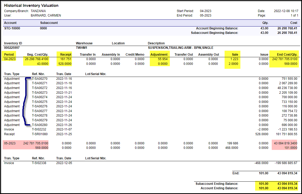 2. If you look at peirod 04-2023 the cost of the item was TZS 26 298 768.41/43 = 611 599.26 in the beginning of the month. In summary you