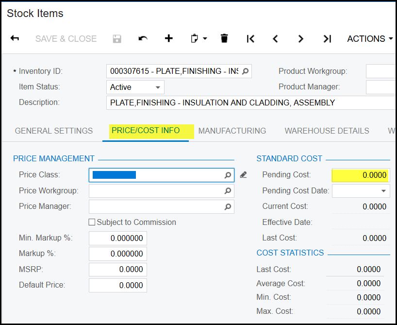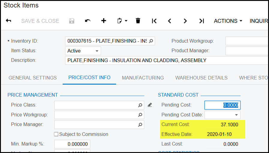 4. The pending price will now be zero and the current cost will be your new standard cost price, see below.