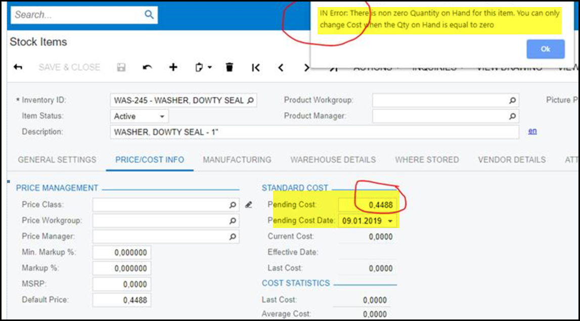 2. When an item has qty on hand a price adjustment will have a financial transaction. See below the error which you will get when trying to update the cost for an item that has qty on hand.