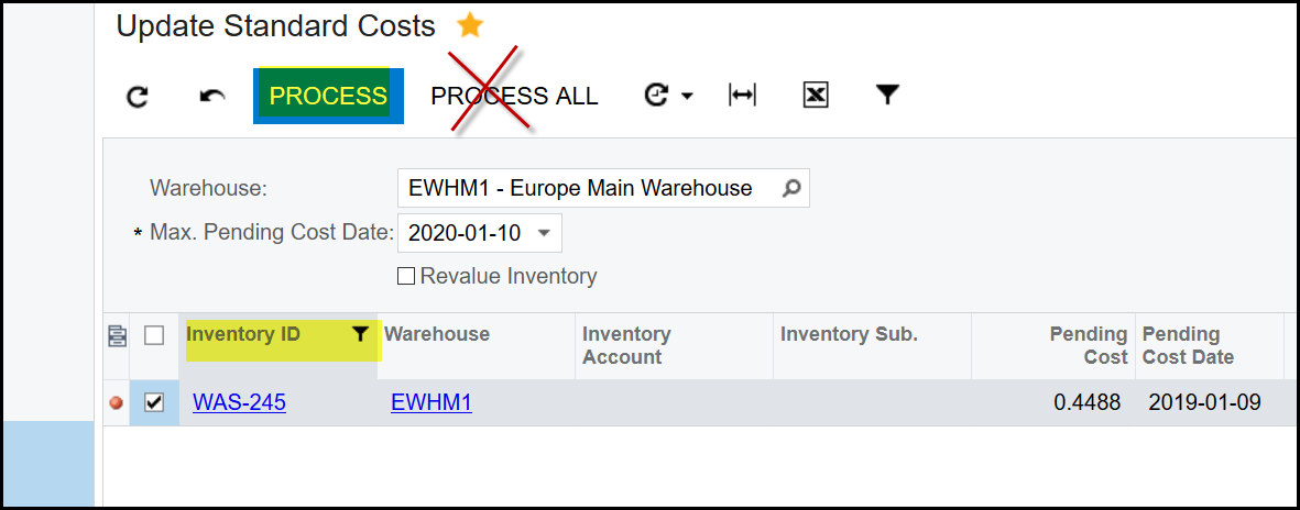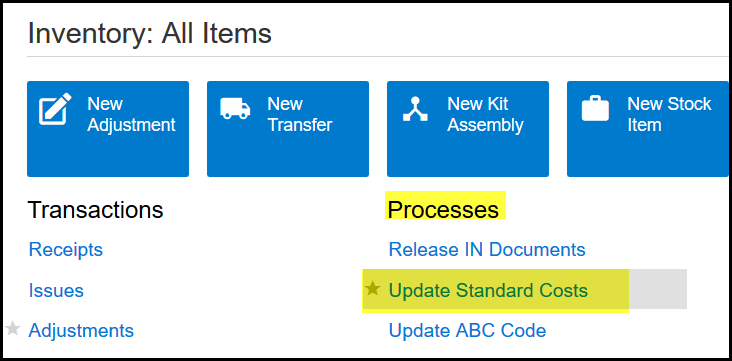 5. After you saved the pending cost go to Inventory>Processes>Update standard Costs.