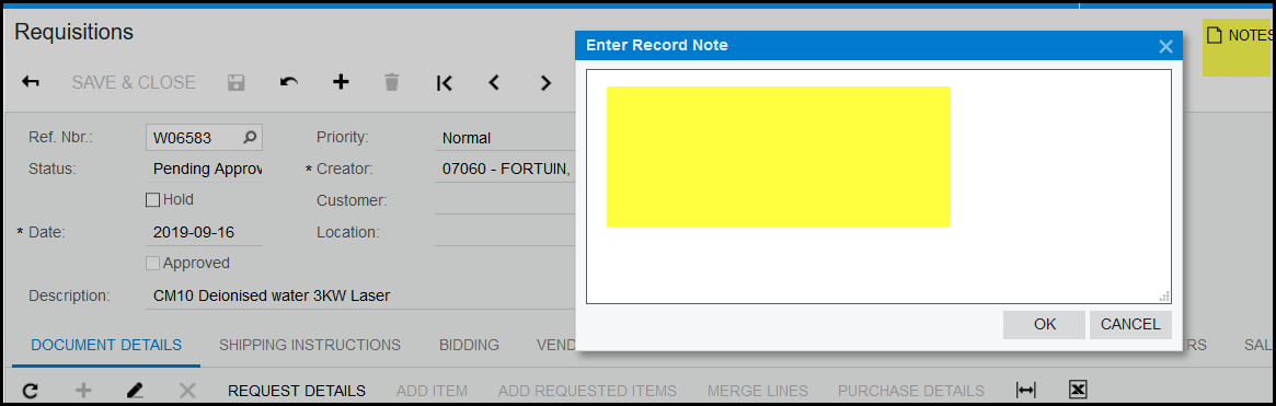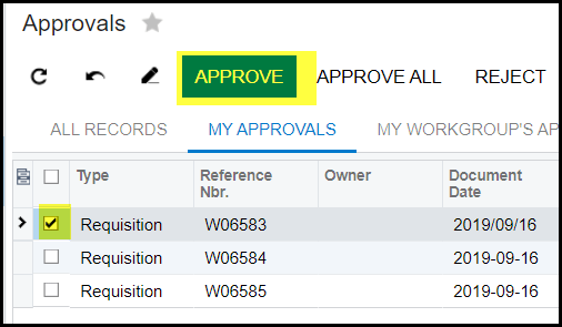 4. Follow the same steps to reject and click on reject - it is helpful to add a note in the space provided on the requisition - Notes.