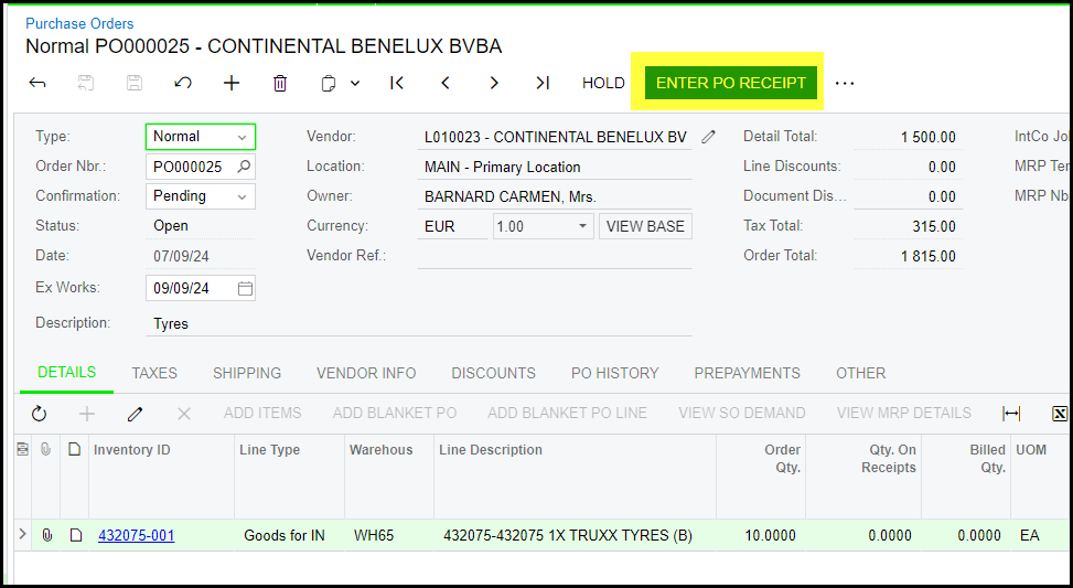 How to do the PO receipt - click on Enter PO receipt on the PO screen