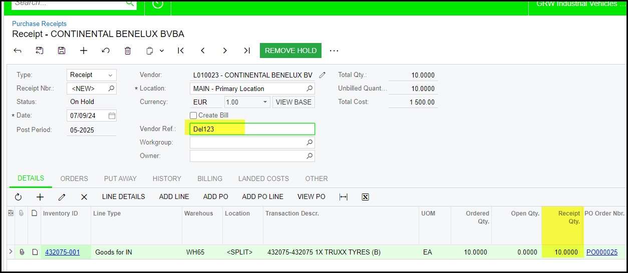 2. On to purchase receipt enter your vendor ref. (delivery note or invoice nr of the supplier)