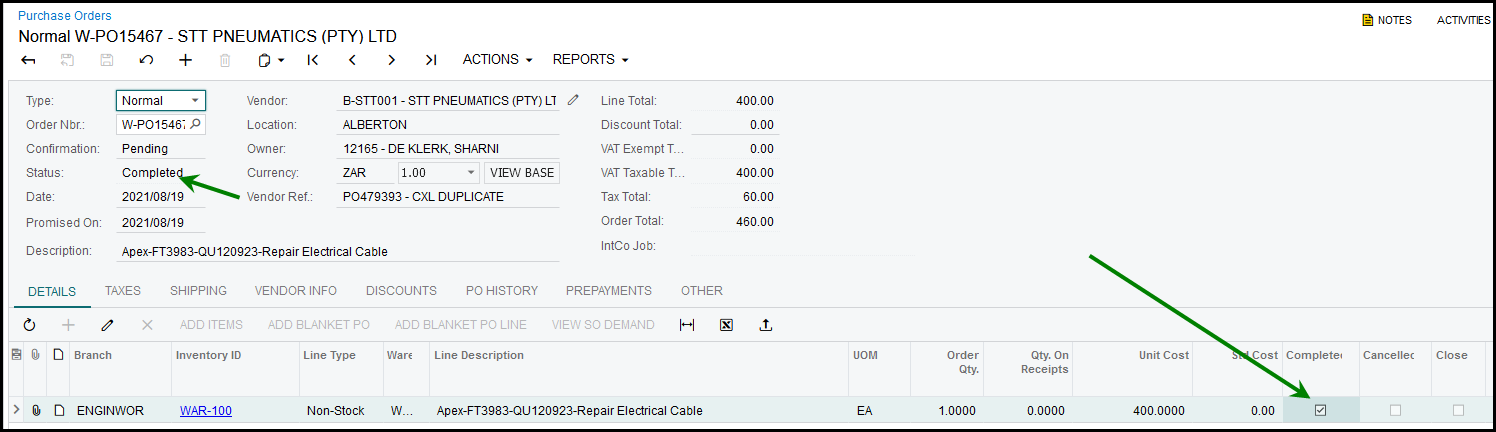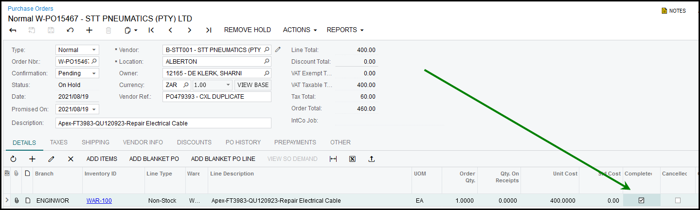 3. Your order will be 'on hold', your specific order line will show 'completed', untick it.