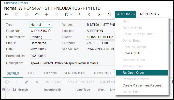 2. Go to Actions to Re-open your order.