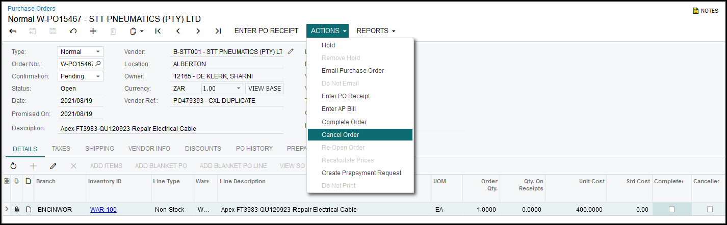 5. Go to Actions and 'Cancel Order'