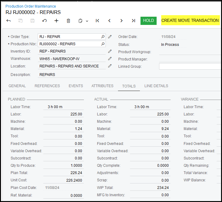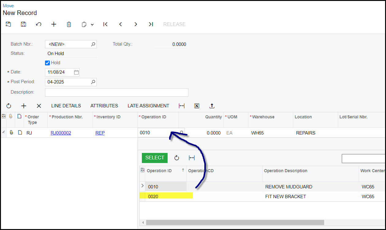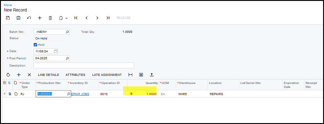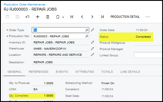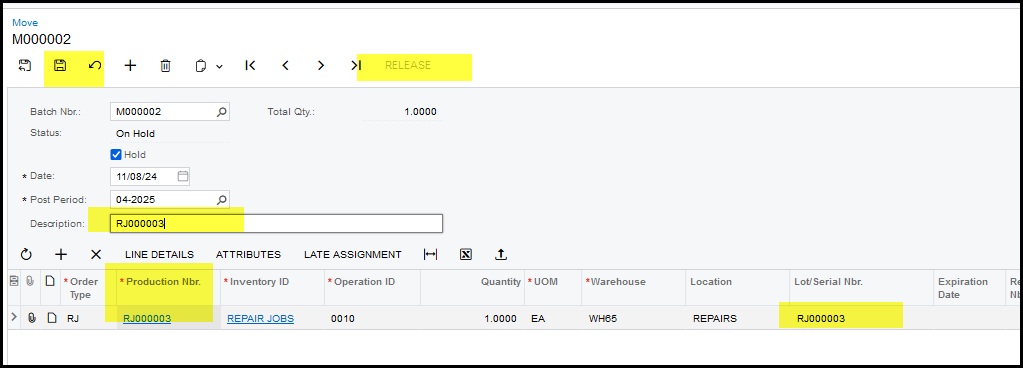 4. Copy the production order nr to 'Lot/serial number and the description. Save and Release.
