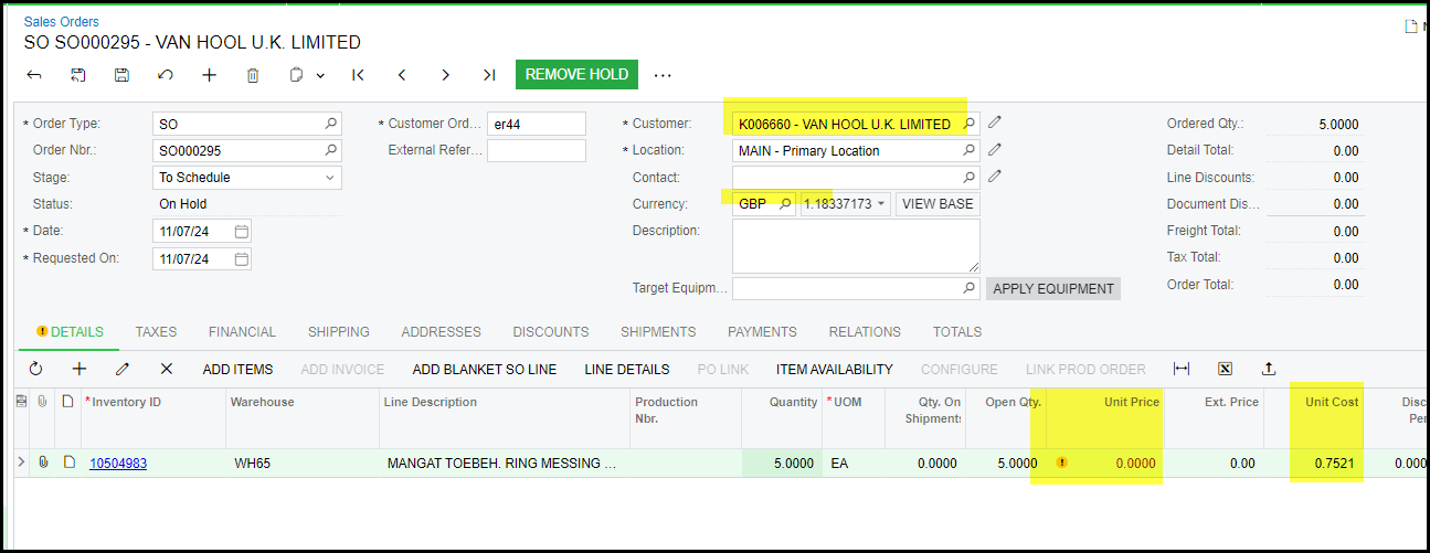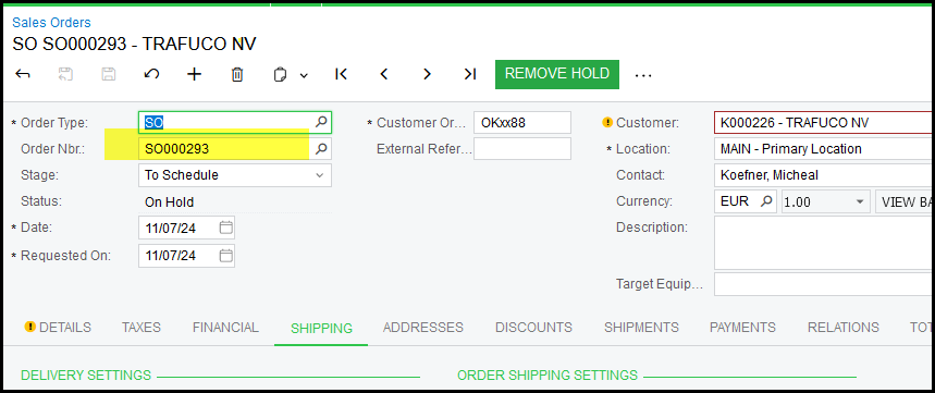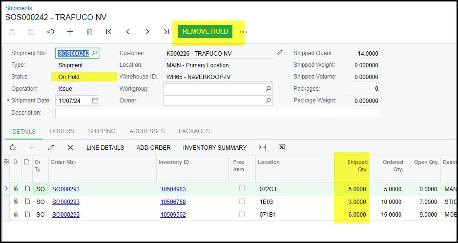 Click on remove hold on the shipment. Now ready for stores to pick the parts.