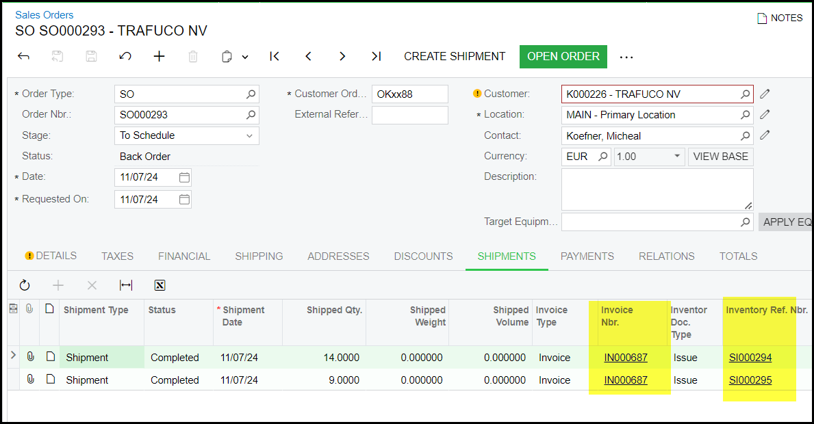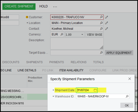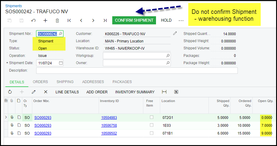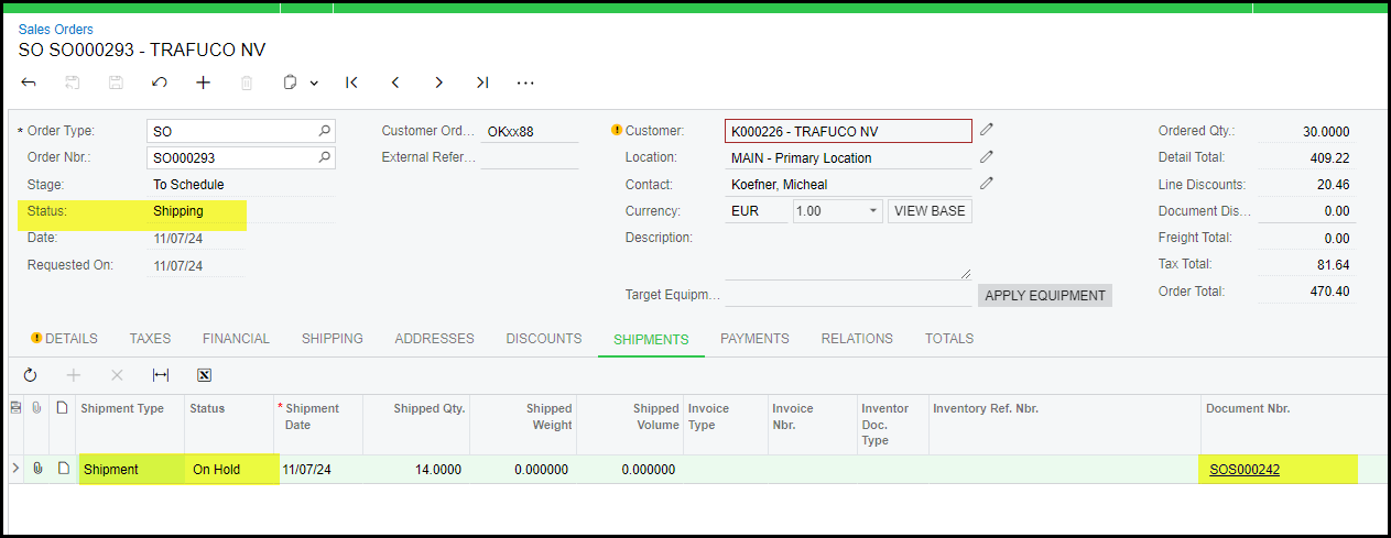 9. The sales order status is 'shipping' and the Shipment is On Hold, Remove Hold - The Status op the Shipment is OPEN - Warehousing