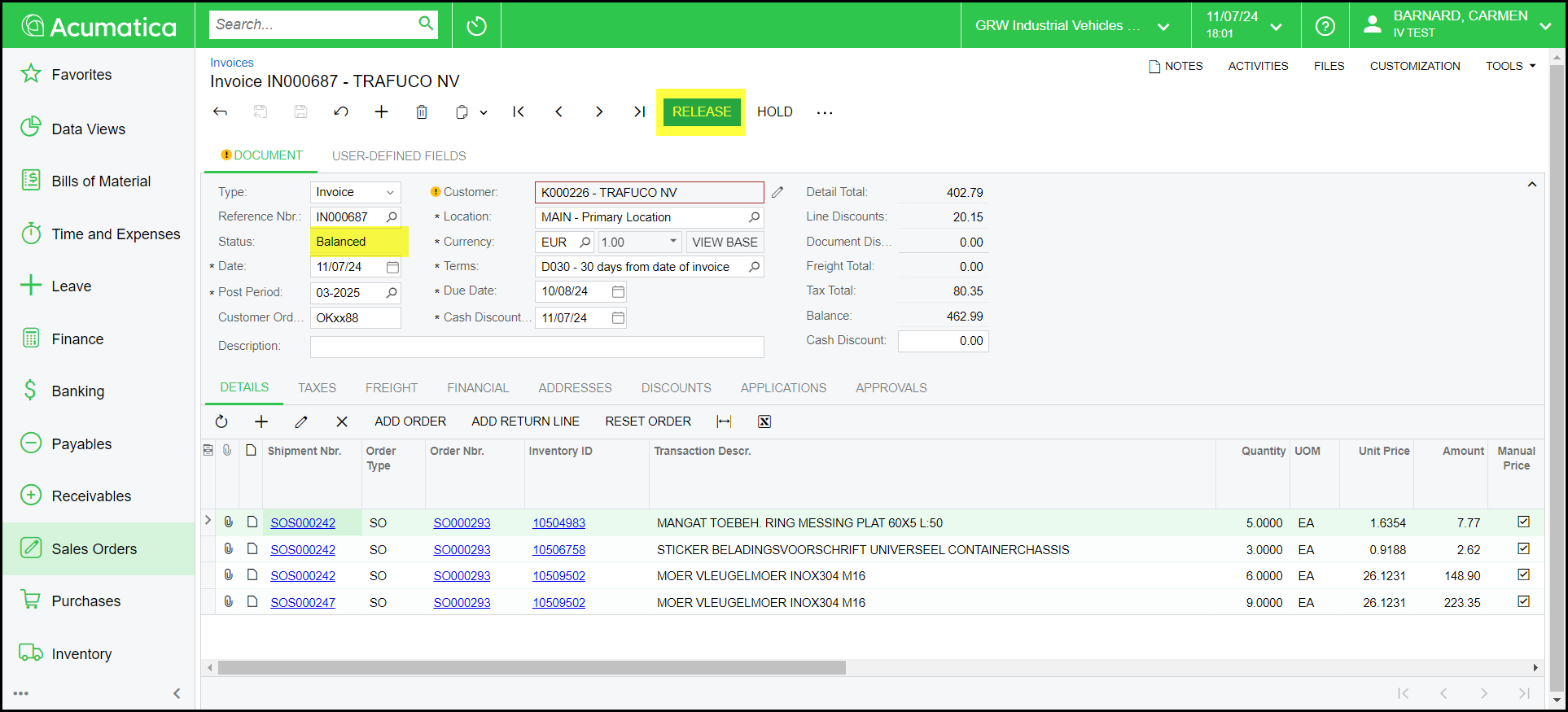 5. Once Elizma has removed the credit hold the status will be OPEN and you can create shipment.