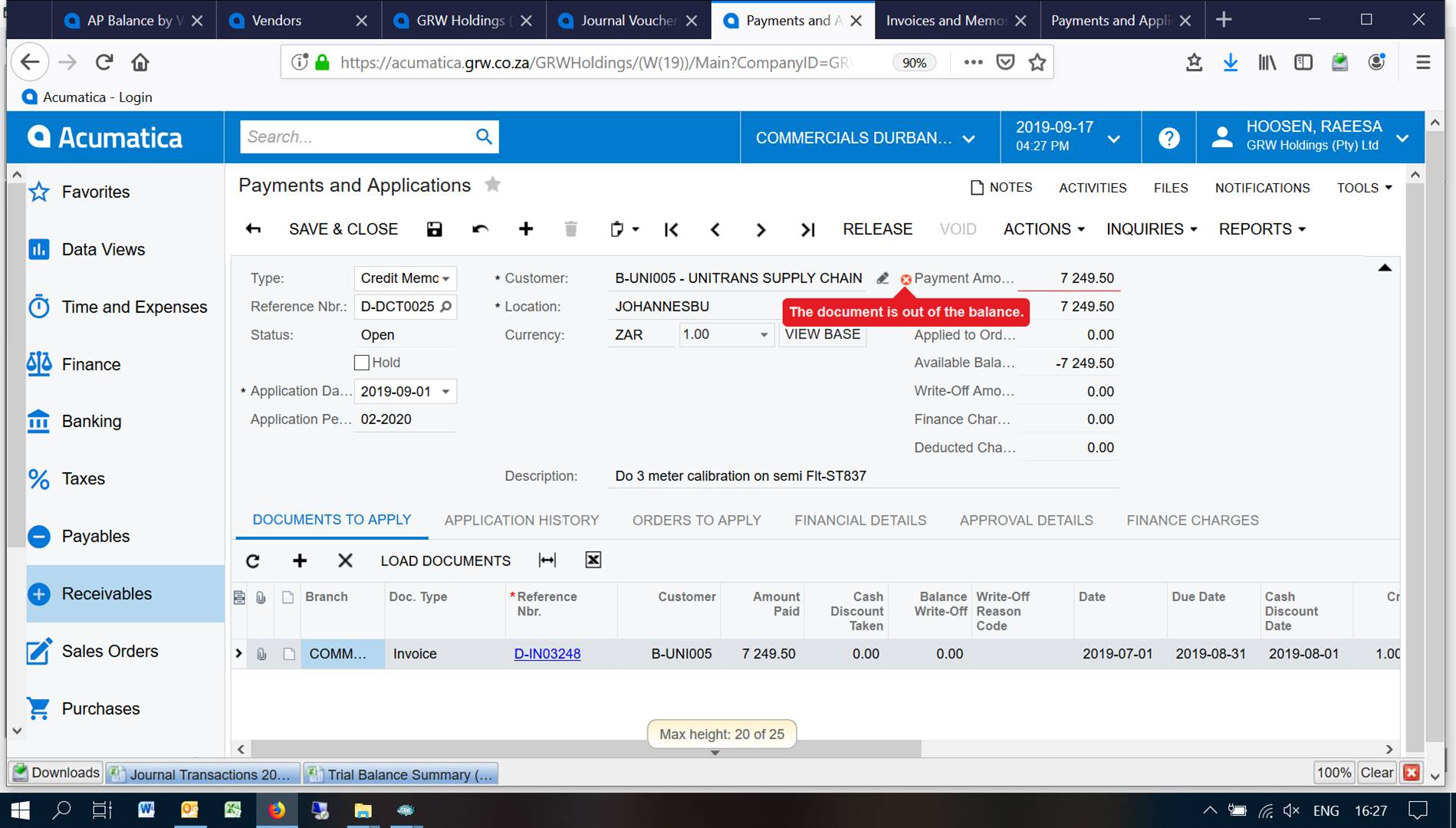 4. Maak die Payments and Applications screen oop, D-DCT00251, dan sal jy sien die balans is nou reg.