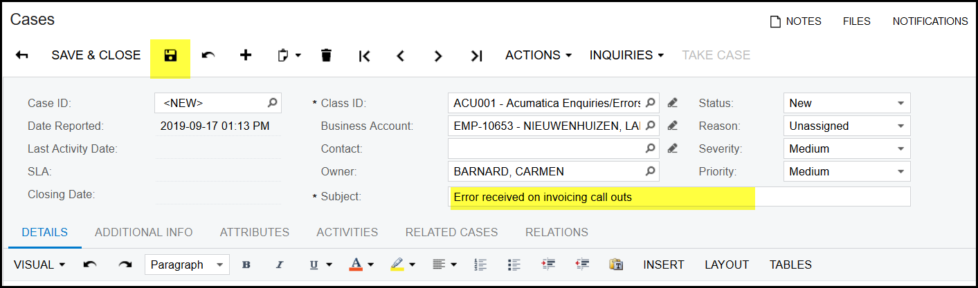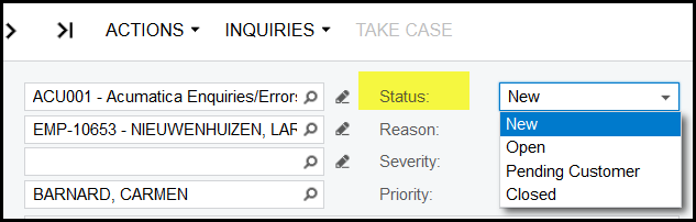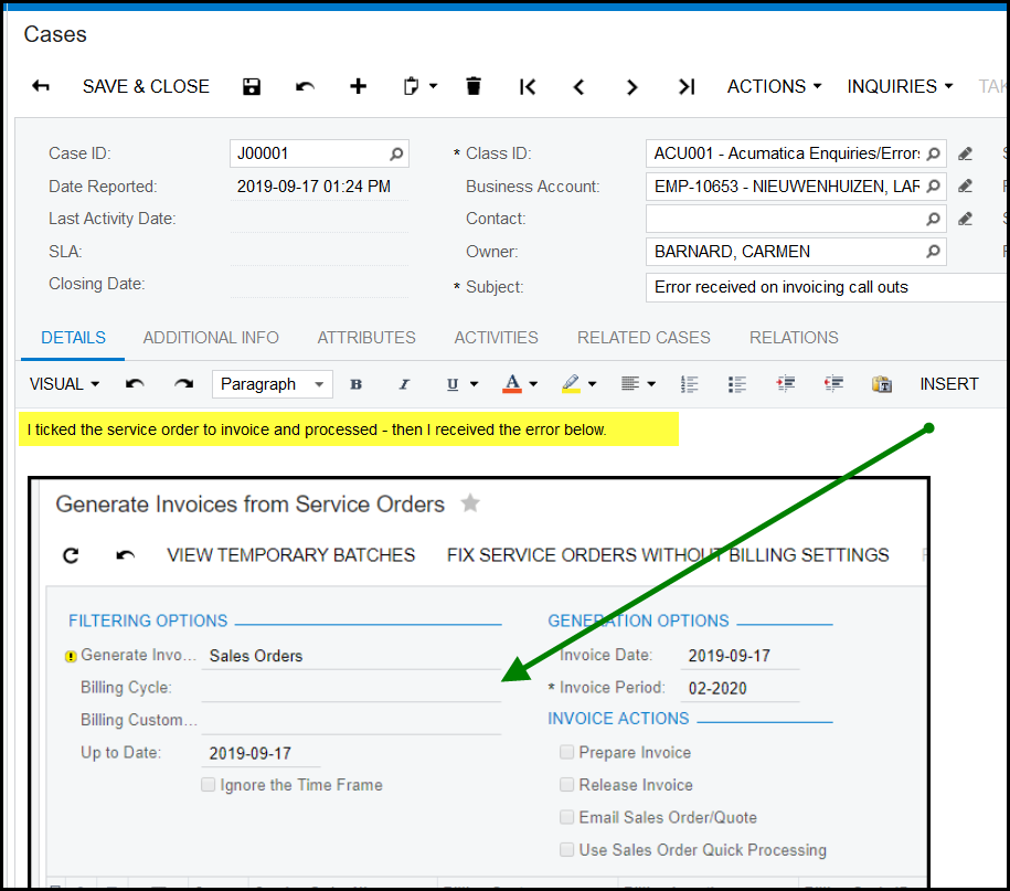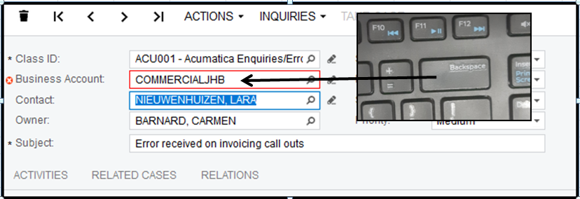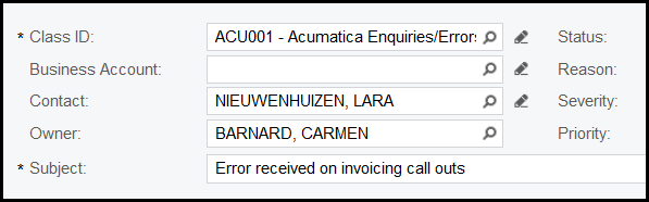 5. Select ACU001-Acumatica Enquiries/Errors Logged/Training needed.