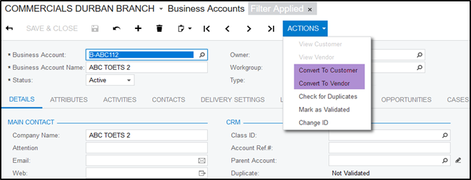 8. Click on Actions and 'convert to customer/vendor' (Only specified people will have access to do this)