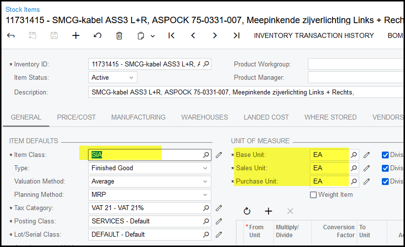 3. Select your item class - it is important to link the stock item to the correct class.