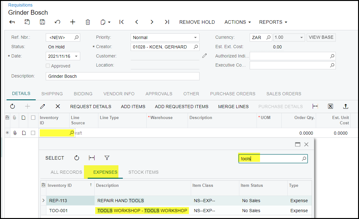 8. Go 'Inventory ID' in the line you have added and click on the search