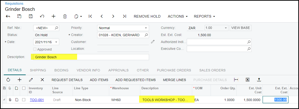 - Your line description have to be changed to the correct description - see below 'Tools workshop' have to be changed to Grinder Bosch.