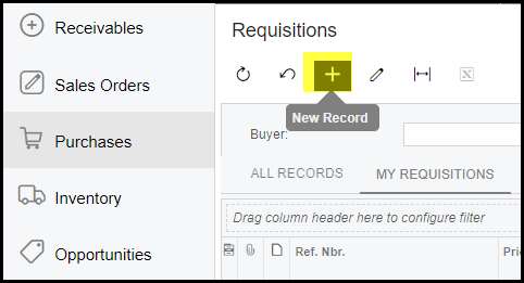 Go to purchases>Requisitions>Click on the + to create a new requisition.