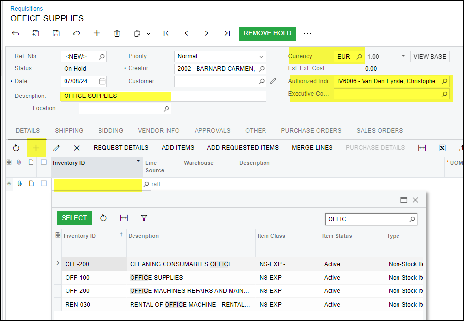 Click on the plus to add your inventory id - this is a list of non-stock and stock items - you can search by description.