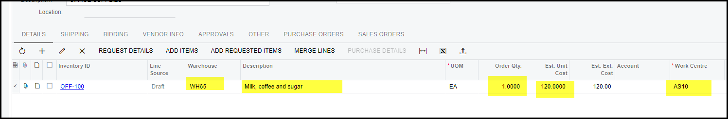 4. Complete your warehouse, description of the line qty, Ext Unit cost and workcentre