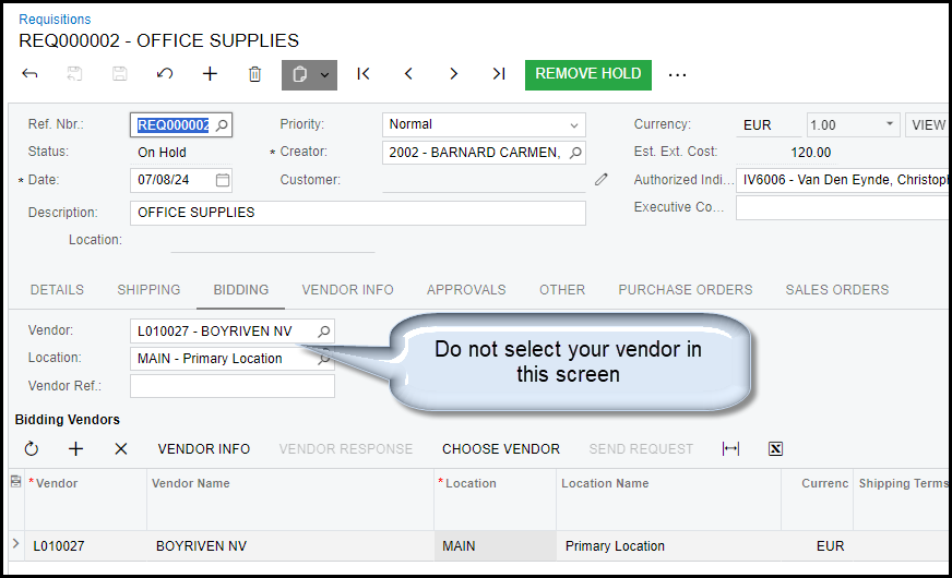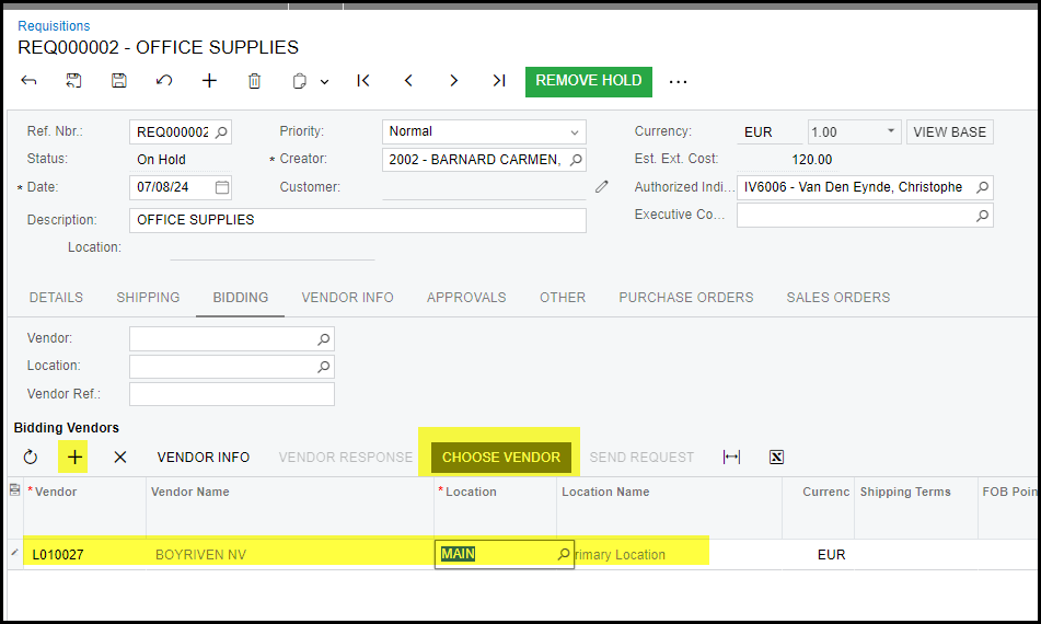 Choose vendor will complete your bidding - make sure that you select the correct supplier.