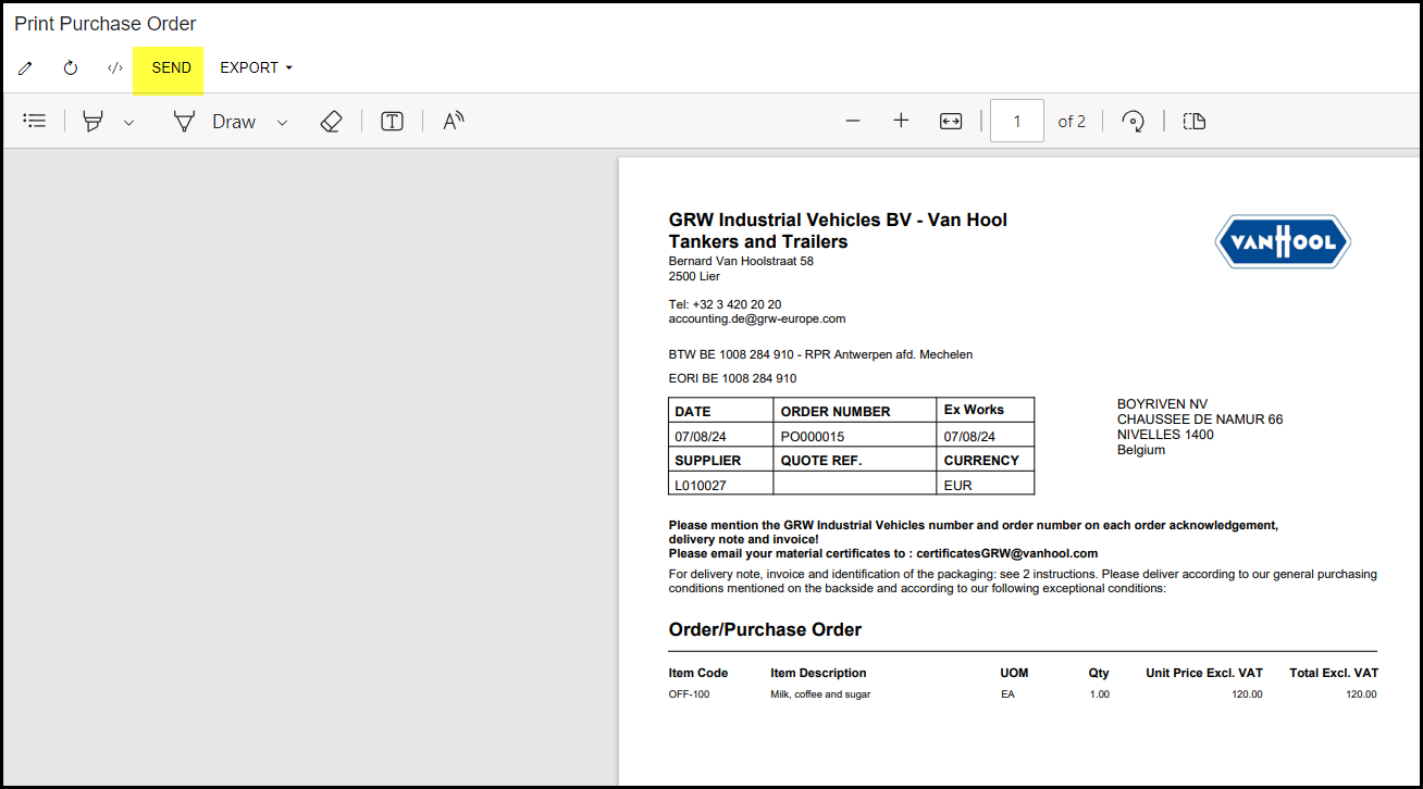 Click on send to email your PO or Export to pdf to print.