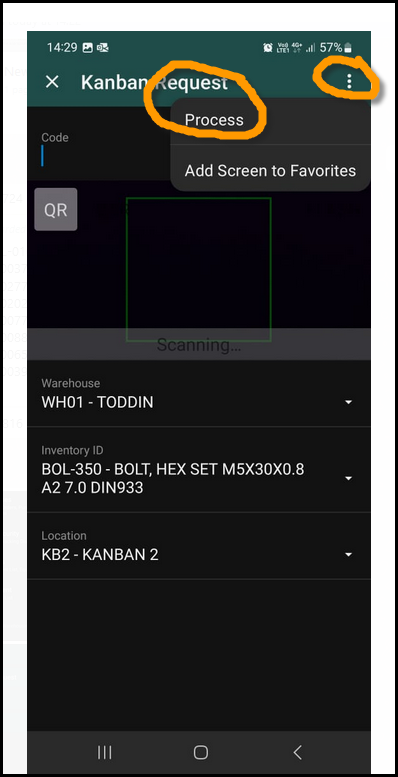4. Click on the 3 dots and then process. Your kanban request will be processed.