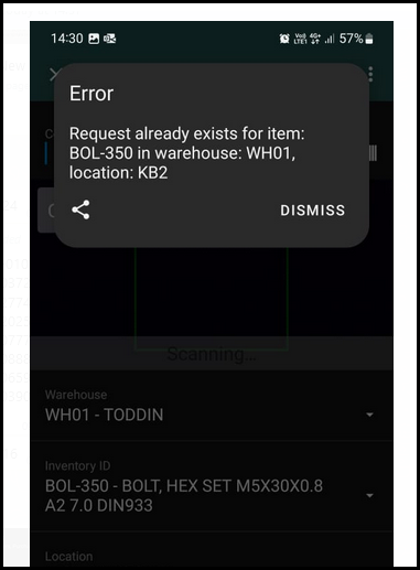 5. You will get the follow error if the is already a kanban request for this item. There can only be one kanban request per item and location.