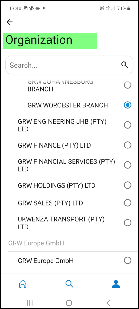 7. Scroll down or search in Organization and select your company.