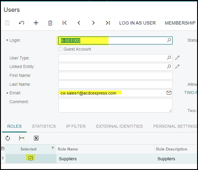 2. Create the supplier as a user, the login is the supplier code and the password is the same, just in lower case. Add the email of the supplier. The user must be linked to the 'suppliers' role.