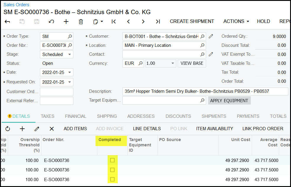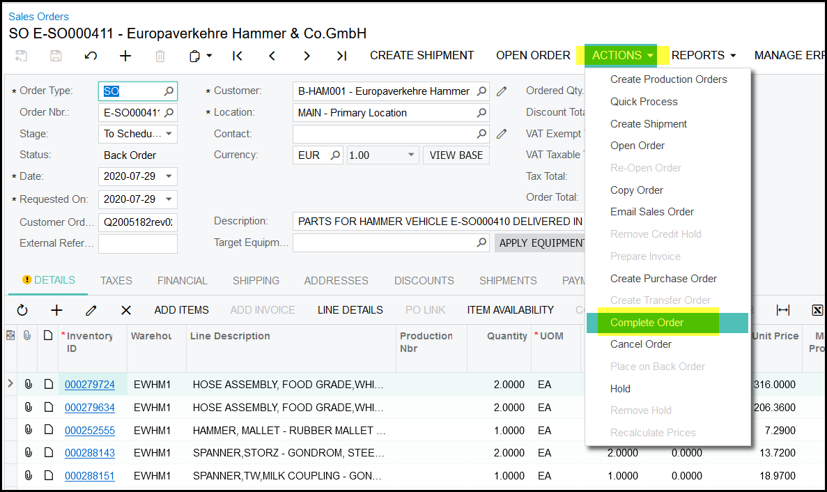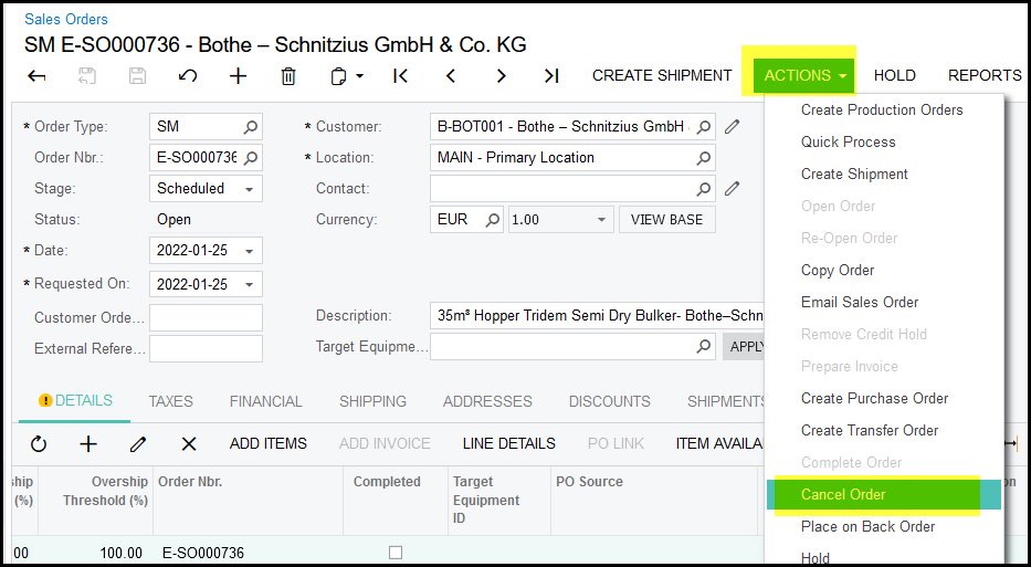 3. The system will not allow you to cancel a sales order if parts were already shipped. You can try to complete the sales order, with actions> complete order.