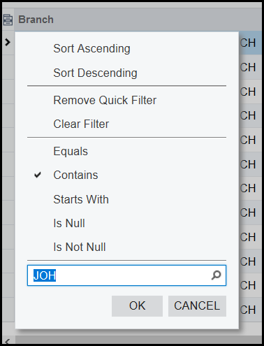 4. To filter by branch click on the header>tick contains and fill in a part of the branch name, OK.