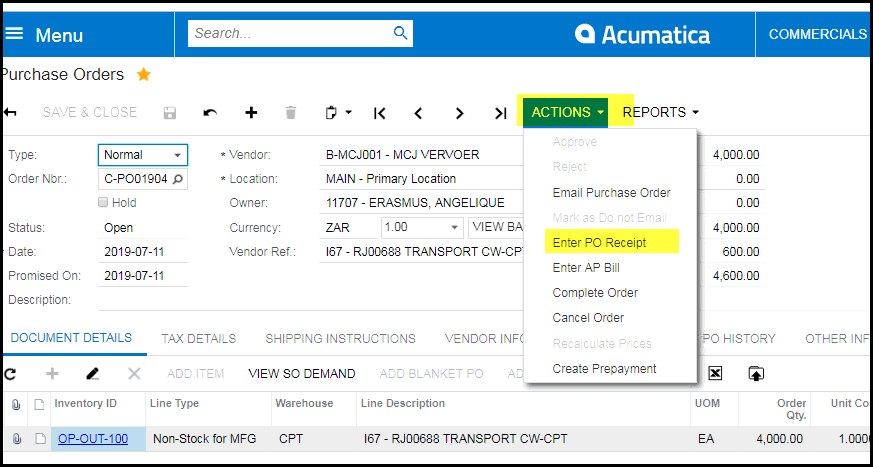 3. Click on 'ACTIONS'> Enter PO Receipt