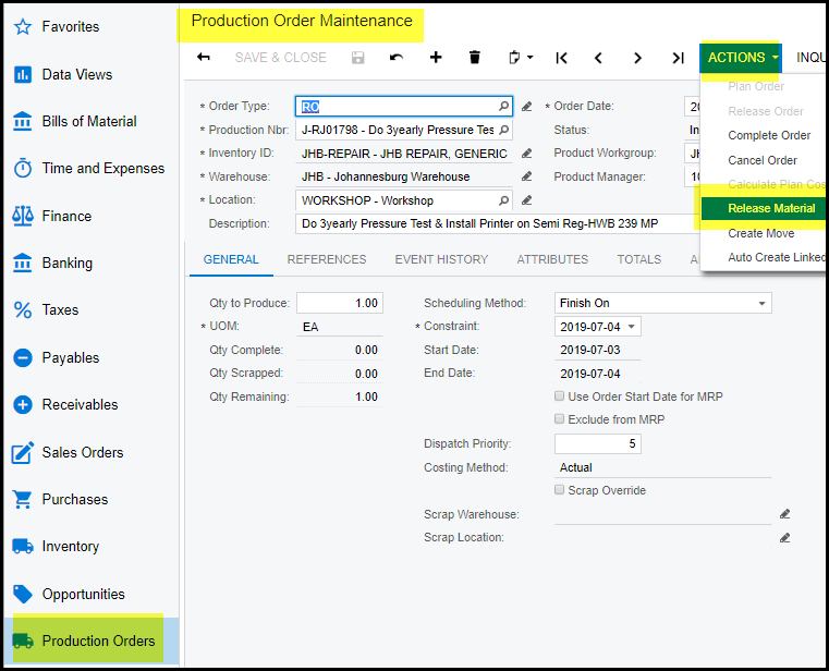- Go to production order maintenance and select your job