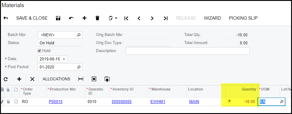 2. Please remember when you return the parts, to put in a NEGATIVE quantity.