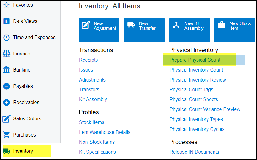 Click on Inventory>Prepare physical count