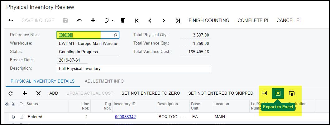 8. Click on your review and export it to excel. This can be used to fill in the counted quantities.