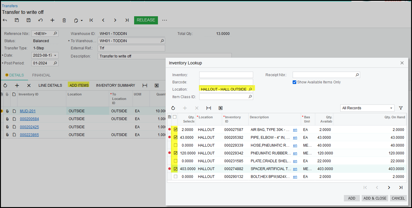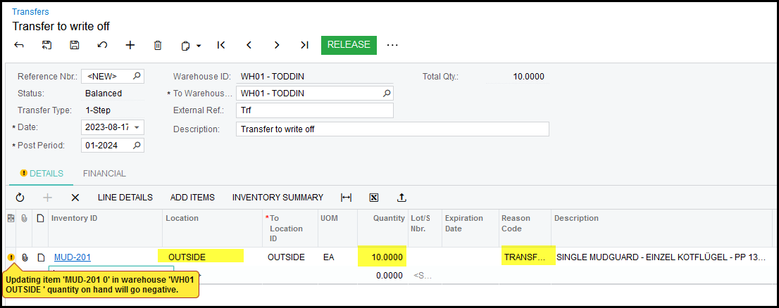9. When I added the MUD-201 it automatically filled in the location of the item because it is the default location for the item.