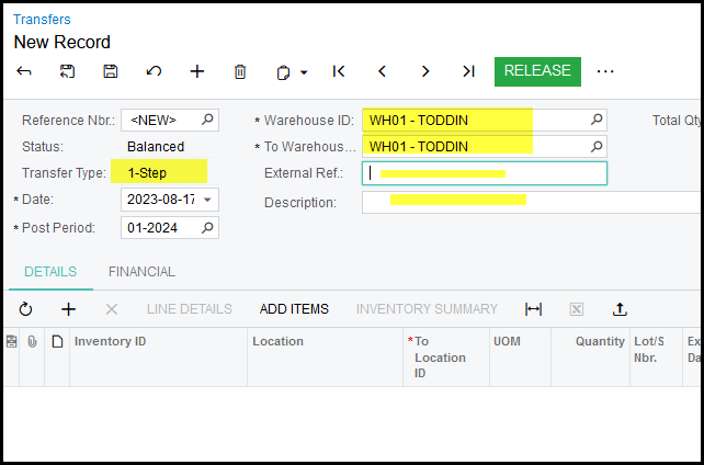 2. The system will default to a 1-step transfer (2-step transfers is used when you want some else to receive the transfer for a different warehouse.)