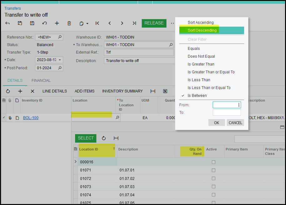 6. In the search for location it will sort on location by default, but change it to qty on hand descending then all your locations with stock on hand will show.