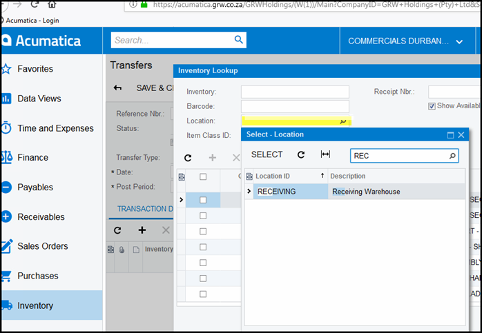 7. You are moving stock from receiving, type in the location search receiving.