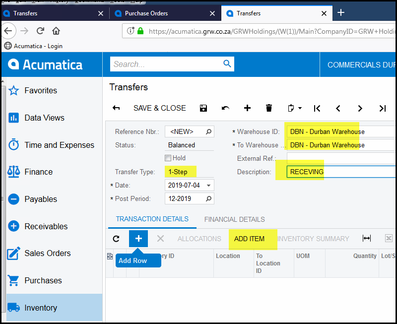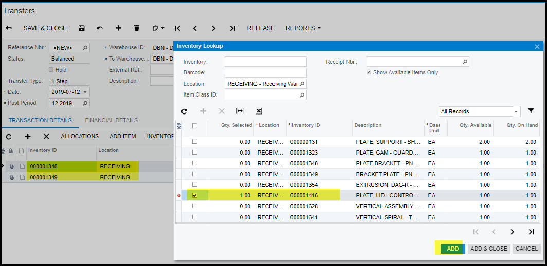 14. When done with add & close, you will have to add your location to where you want to transfer the stock.